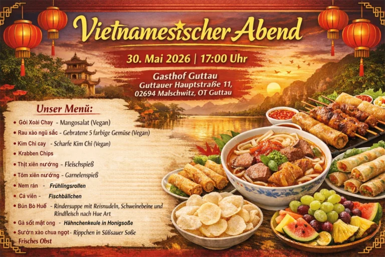 Wir laden Sie herzlich zu einem besonderen Abend ein, der kulinarische Genüsse und kulturelles Wissen Vietnams miteinander verbindet. Die Veranstaltung richtet sich an alle, die die vietnamesische Küche lieben, neue Geschmackserlebnisse suchen und mehr über die faszinierende Kultur Vietnams erfahren möchten.