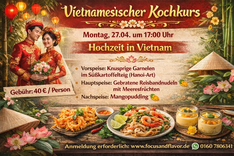 Wir laden Sie herzlich zu einem besonderen Abend ein, der kulinarische Genüsse und kulturelles Wissen Vietnams miteinander verbindet. Die Veranstaltung richtet sich an alle, die die vietnamesische Küche lieben, neue Geschmackserlebnisse suchen und mehr über die faszinierende Kultur Vietnams erfahren möchten.
