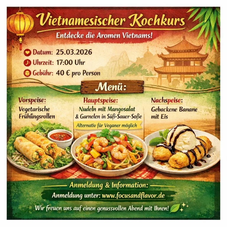Tauchen Sie ein in die faszinierende Welt der vietnamesischen Küche! Unsere Kochkurse verbinden authentische Rezepte mit spannenden Einblicken in die Kultur Vietnams. Gemeinsam kochen, genießen und lernen wir – jedes Mal zu einem besonderen Thema.