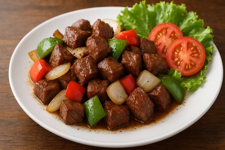 Bò Xào Lúc Lắc – auch bekannt als vietnamesisches Shaking Beef – ist ein beliebtes Gericht aus zart angebratenen Rindfleischwürfeln, die gemeinsam mit Paprika, Zwiebeln und Knoblauch in einer würzig-süßlichen Sauce geschwenkt werden.