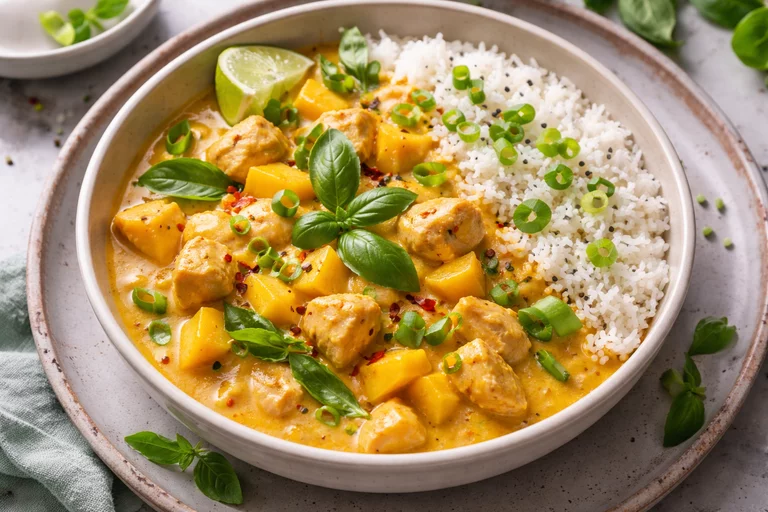 Dieses aromatische Hähnchencurry vereint die Wärme exotischer Gewürze mit der natürlichen Süße reifer Mango. Zartes Hähnchenfleisch wird in einer cremigen Sauce aus Kokosmilch, Curry und fruchtiger Mango schonend gegart und entwickelt dabei ein wunderbar ausgewogenes Zusammenspiel aus süßen, würzigen und leicht pikanten Aromen.
