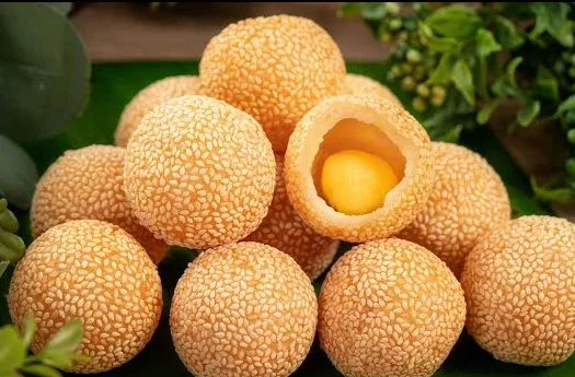 Bánh Rán Lúc Lắc ist ein beliebtes vietnamesisches Dessert, das für seine knusprige Hülle und die aromatische Mungbohnenfüllung bekannt ist. Die goldbraunen Sesam-Bällchen sind außen knusprig und innen weich – ein perfekter Snack für zwischendurch oder ein Highlight auf jeder Dessertplatte.