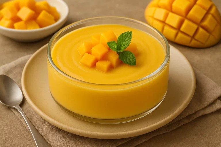 Dieser cremige vietnamesische Mangopudding ist ein erfrischendes Dessert aus frischer Mangopüree, Milch, Sahne und Gelatine. Er ist leicht, fruchtig und perfekt für warme Tage – ein beliebtes asiatisches Dessert, das sich schnell und einfach zubereiten lässt.