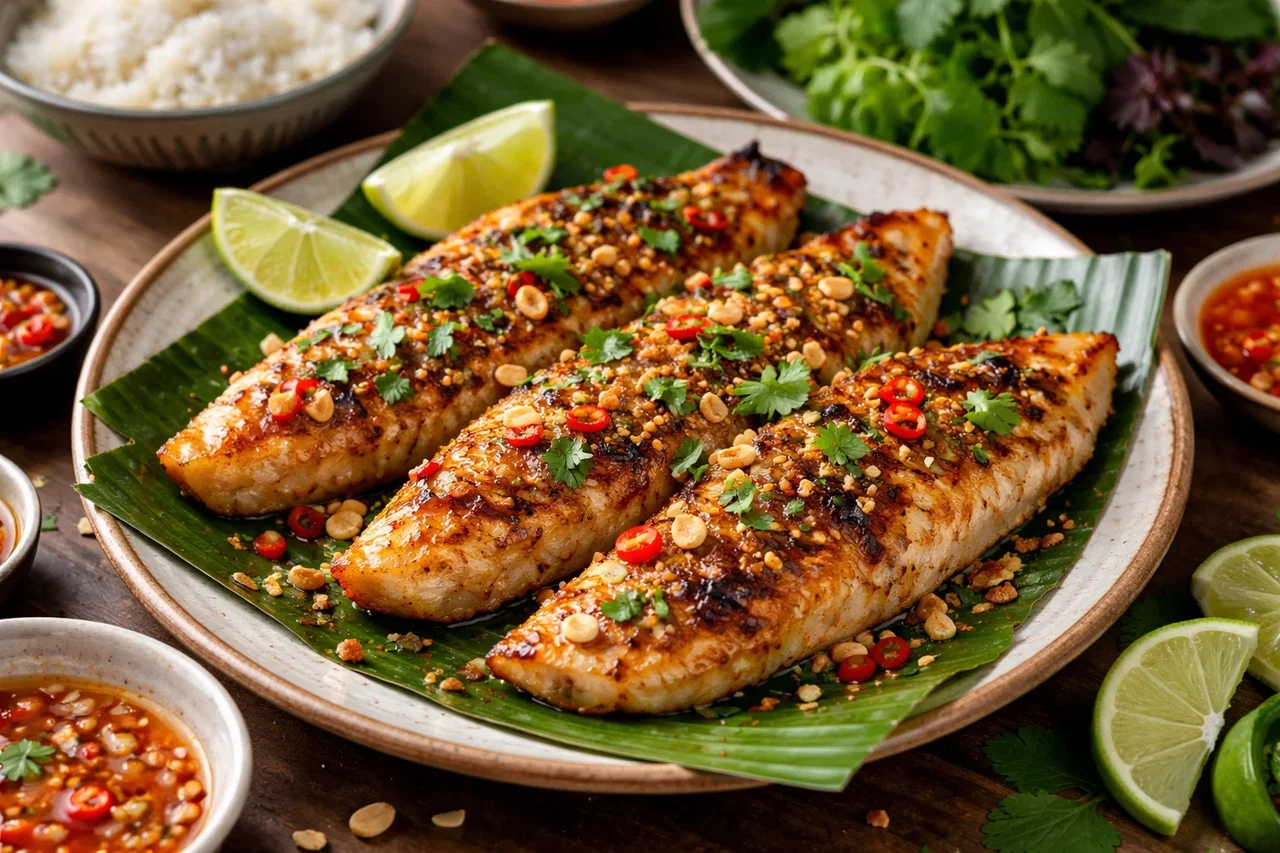 - Grill (empfohlen für echtes vietnamesisches Aroma): Grill auf mittlere bis hohe Hitze vorheizen. Den Rost leicht einölen. Fisch von beiden Seiten ca. 6–10 Minuten grillen (je nach Dicke und ob ganz oder Filet). Nicht zu oft wenden. Der Fisch ist fertig, wenn er schön goldbraun-karamellisiert ist und sich leicht vom Grät löst.
