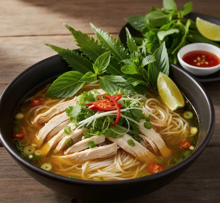 Phở Gà schmeckt besonders authentisch, wenn die Brühe lange auf kleiner Flamme köchelt – so entfalten sich die Gewürze voll und sorgen für die typische Tiefe des vietnamesischen Geschmacks.