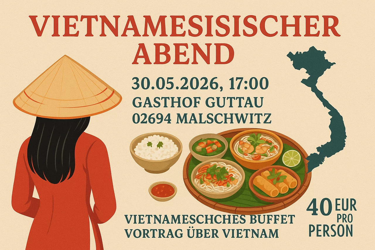 Wir laden Sie herzlich zu einem besonderen Abend ein, der kulinarische Genüsse und kulturelles Wissen Vietnams miteinander verbindet. Die Veranstaltung richtet sich an alle, die die vietnamesische Küche lieben, neue Geschmackserlebnisse suchen und mehr über die faszinierende Kultur Vietnams erfahren möchten.